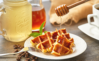 以自製麵團搭配粒珍珠糖的比利時鬆餅烘烤後,淋上自家龍眼蜂蜜,酥脆香甜口感美味極佳